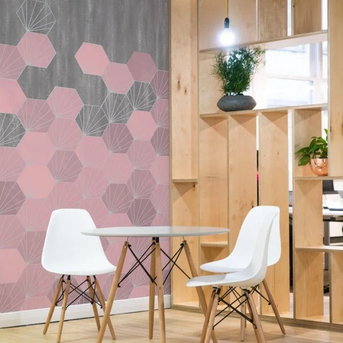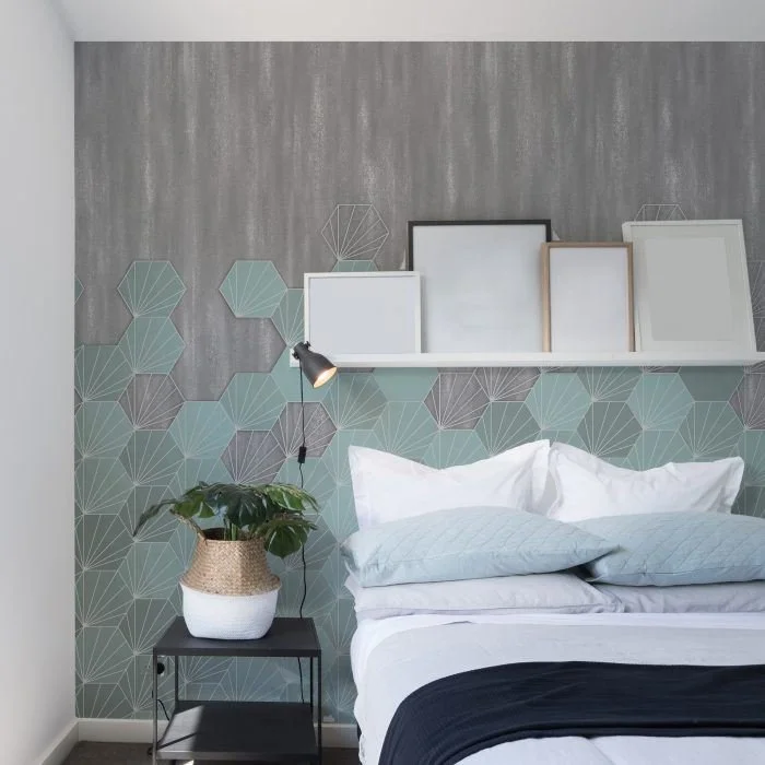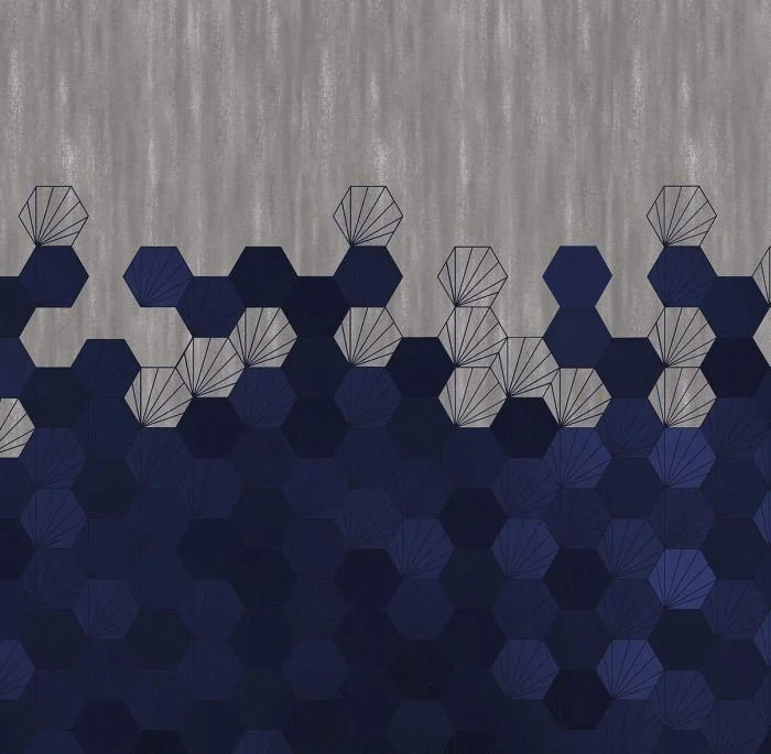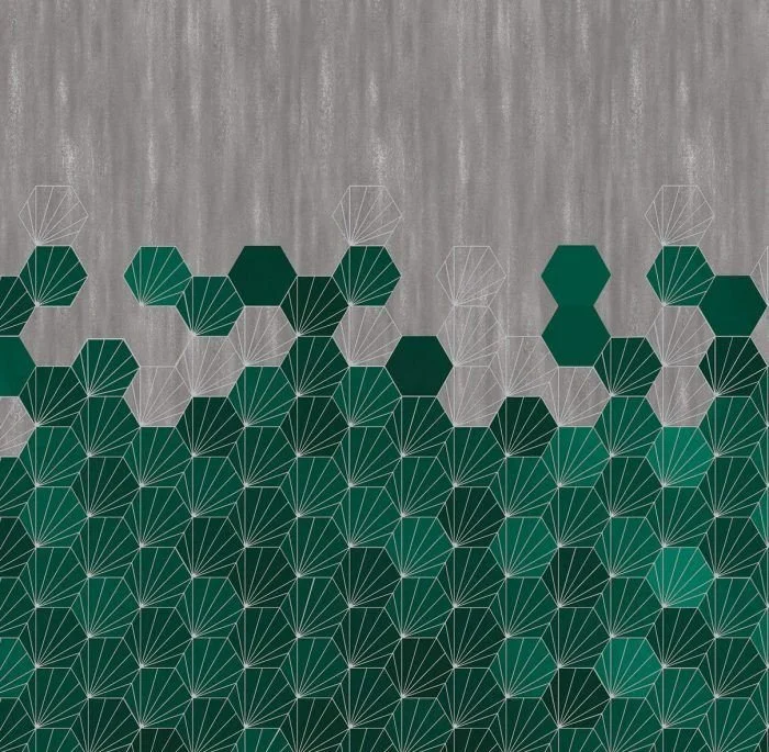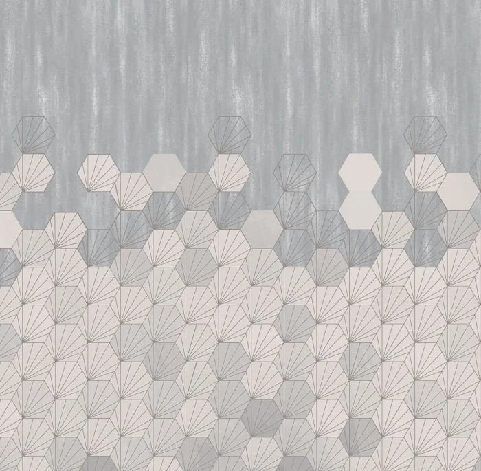 Inspired by art deco design, the hexagonal tile is set against an industrial raw concrete background.