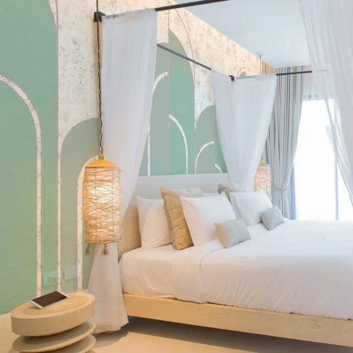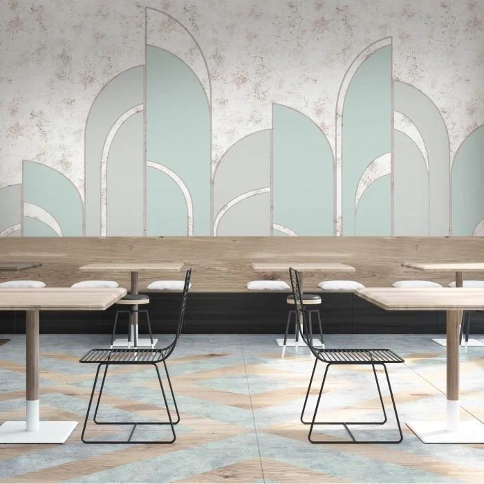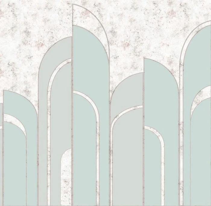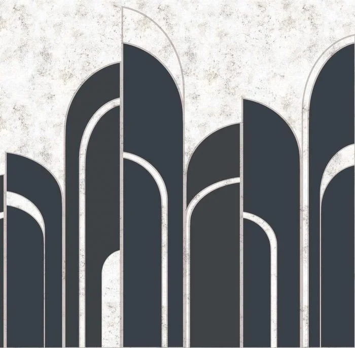 Inspired by room dividers form the Art Deco era this elegant arched panel design is given a modern twist with the raw plastered wall background.